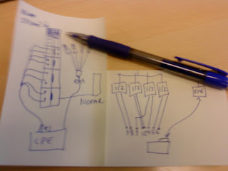 Idag har jag gått kurs. Det här är exempel på hur kopparparen i en TP kopplas i en RJ45 samt kroneplint. Den sista är det ni ser uppe till vänster i bild. Som ni också ser bygger man telefonin med mittenparet, i exemplet kallat 1 och 2. Ja ba; Upplyst!